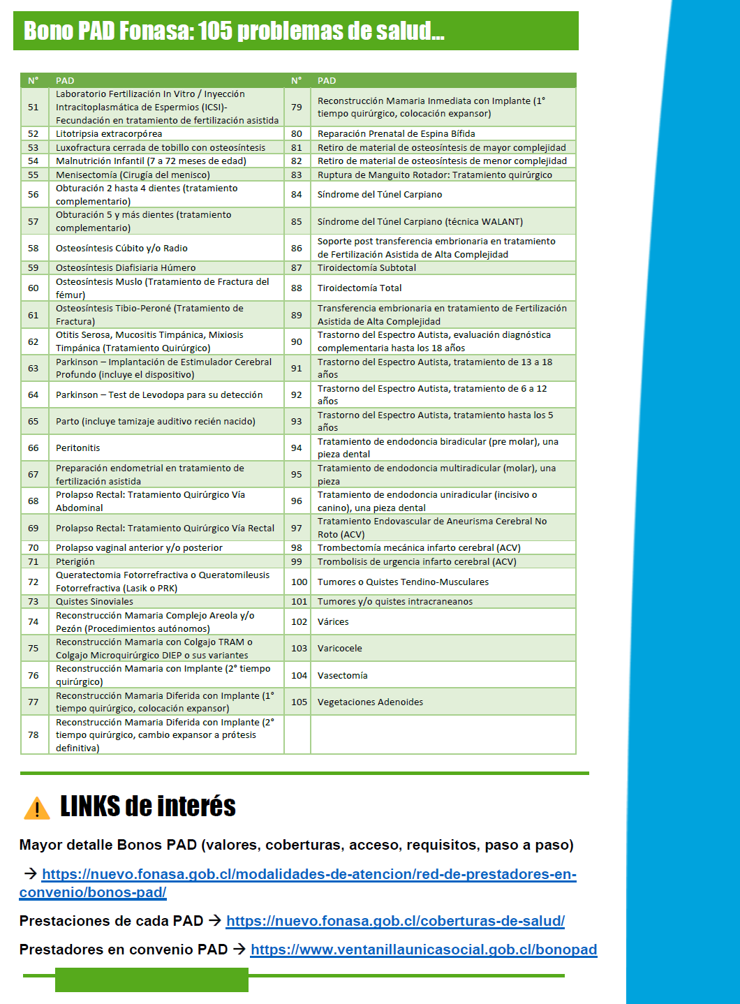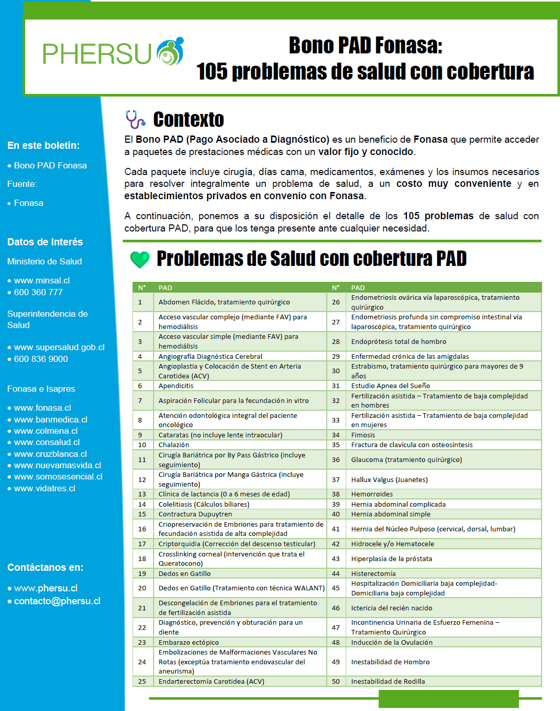 Este Boletín busca informar cada uno de los 105 problemas de salud con cobertura Bono PAD y algo más.