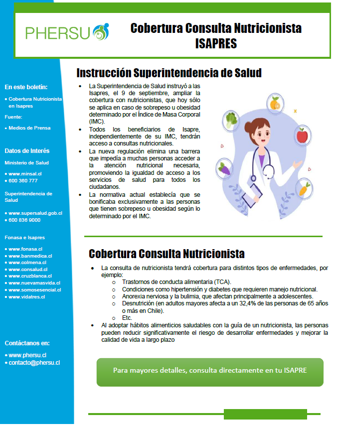 Este boletín tiene por objeto informar a nuestros asegurados que la Superintendencia de Salud instruyó a las Isapres, el 9 de septiembre del 2025, ampliar la cobertura con nutricionistas.