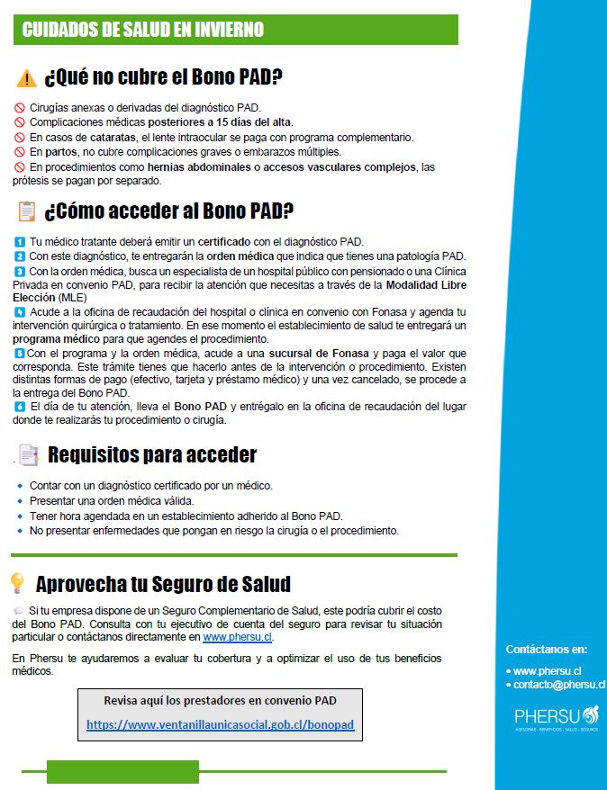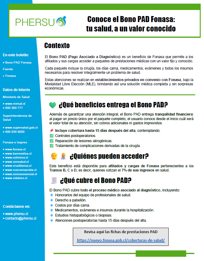 Nuestro boletín “Conoce el Bono PAD Fonasa: tu salud, a un valor conocido” informa los beneficios que entrega este bono, que cubre, como se accede, etc.